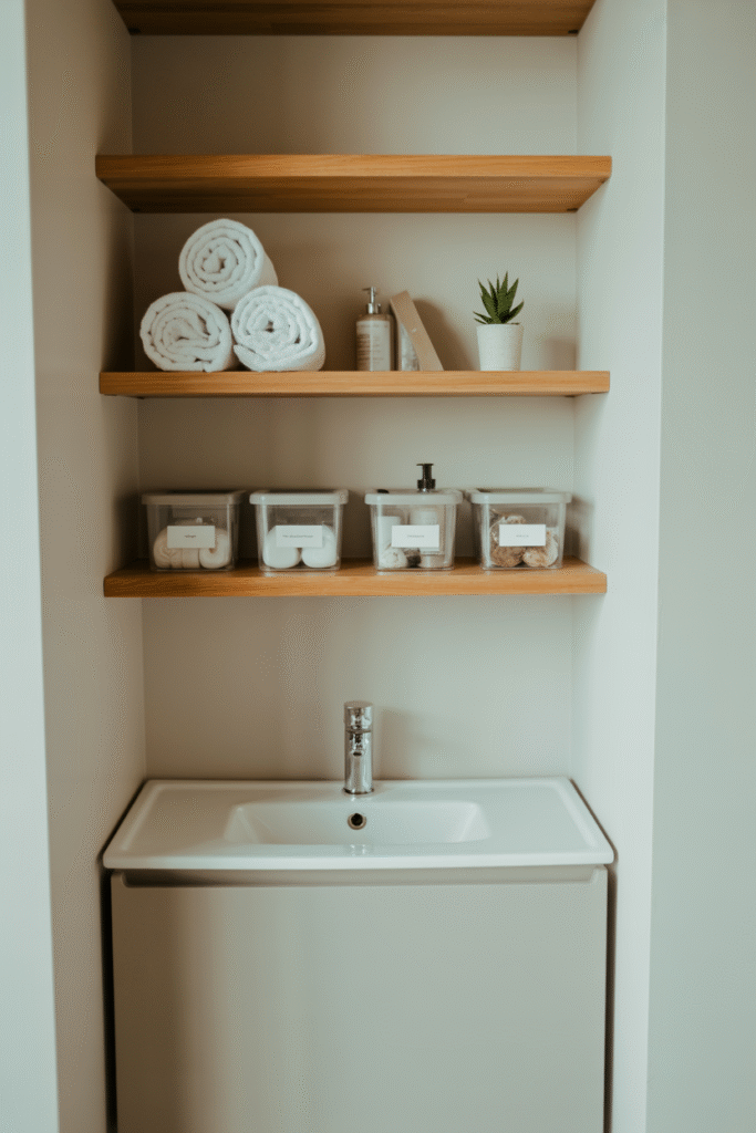 Don’t limit your storage to under the sink. Floating shelves above the sink (about 25 cm / 10 inches deep) are ideal for towels and baskets, while slim, tall cabinets behind the toilet can hold extra rolls and cleaning supplies. I’ve used IKEA’s LILLÅNGEN in several projects it fits almost any budget, looks modern, and adds storage without crowding the space. For renters, tension rods and fabric cubes can be removed when you move.