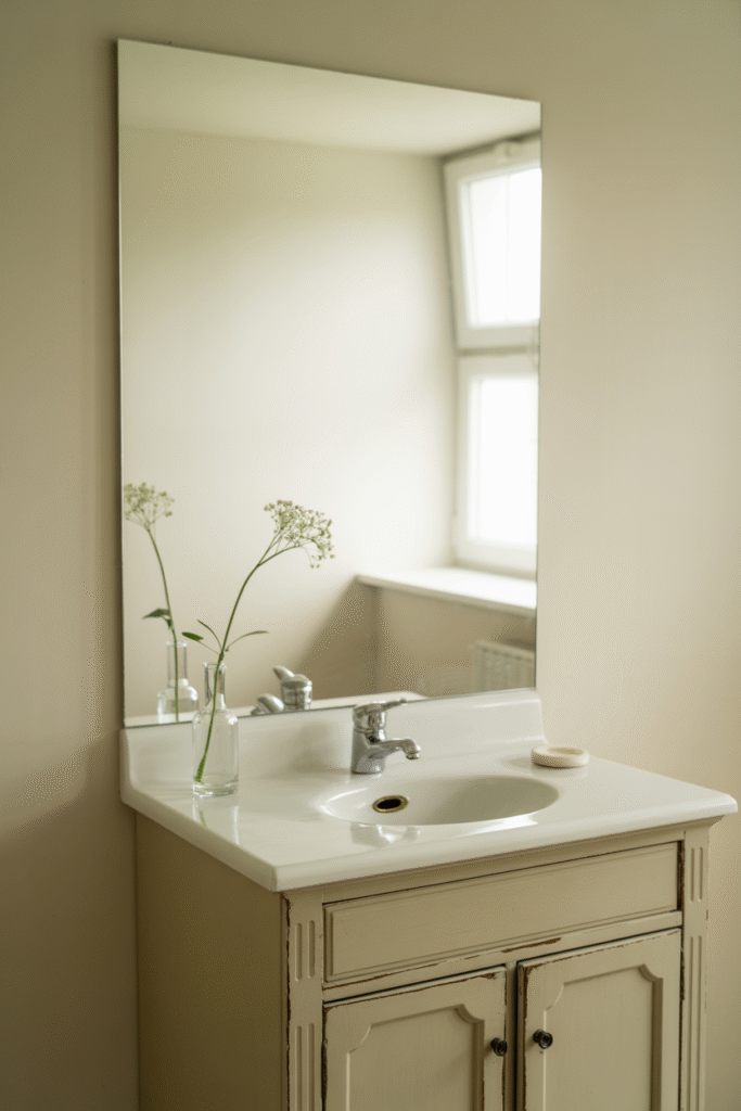 A mirror that’s wider than your sink reflects both more light and more of the room, but don’t go so big that it dominates the space. In a 60 cm (24 inch) wide vanity, a 70 cm (28 inch) wide mirror often strikes the right balance. In my tiny ensuite, I installed two 30 cm (12 inch) round mirrors side by side—sufficient reflection without overcrowding.