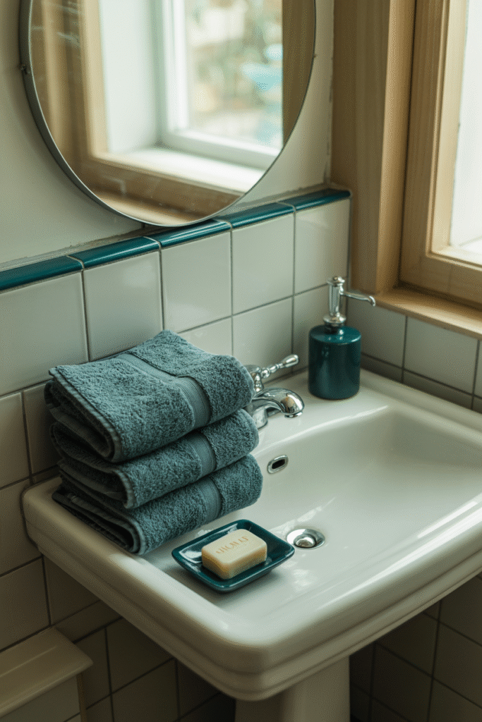 Rather than going “all white” or strictly minimalist, pick a colour, finish, or material and repeat it throughout the room. In my own bathroom, I love subtle teal accents—repeated in the grout, towels, and a single ceramic accessory. This creates unity without making the space feel too “designed” or sterile. Your small bathroom should feel like you, not like a magazine.