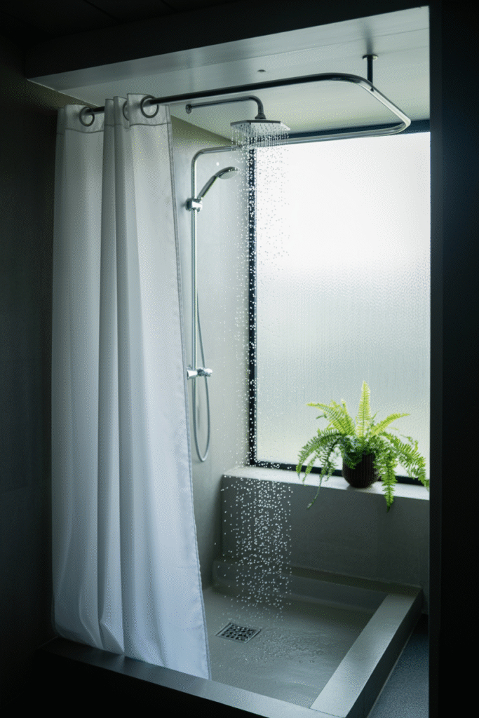 Glass panels look great but need clear space to open. In very tight bathrooms, a ceiling-mounted fabric shower curtain (with a weighted liner to keep water in) gives you a barrier that uses zero floor space and can be changed easily for a fresh look. I recommend a subtle print to hide water spots and liven up a small space.