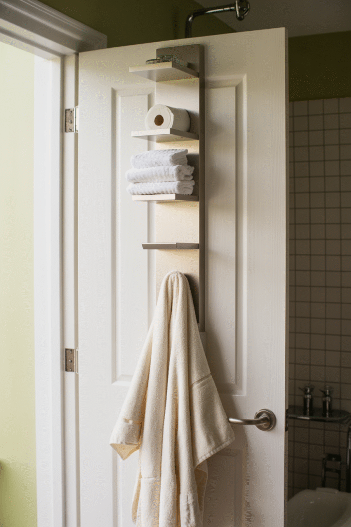 This is one of the most underutilized spaces in a small bathroom. Installing a slim wall-mounted cabinet (about 18 cm / 7 inches deep) or simply adding hooks and rails here can hold extra towels, toilet paper, and daily essentials. In my own flat, this trick eliminated the need for a bulky towel rack and kept the main area clutter-free. Just make sure whatever you hang doesn’t slam into the wall when the door opens—soft-close hardware is a good investment.