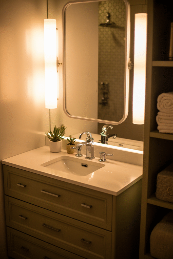 Bright, even lighting makes any room feel less cramped. I always recommend swapping out a single dome light for wall sconces on either side of the mirror, or trying an under-mirror LED strip. This setup gives you better light for daily routines and visually “opens” up the space. In one project, we used battery-powered LEDs—surprisingly effective and easy to install, with no wiring hassle.