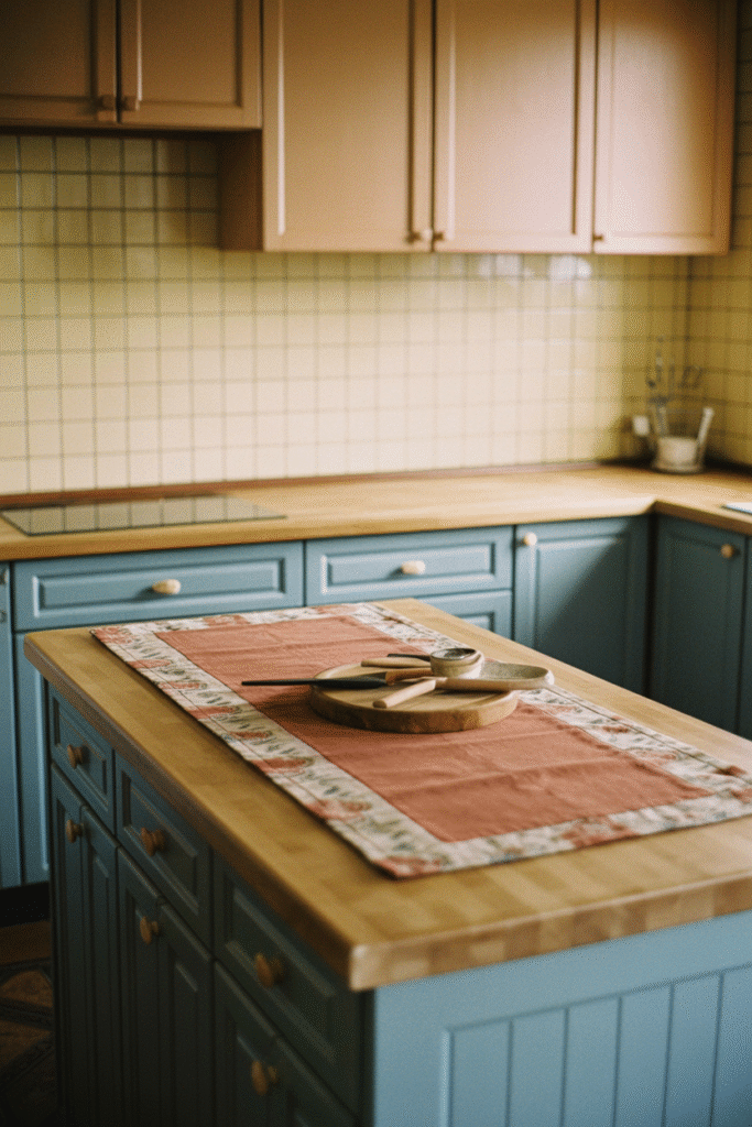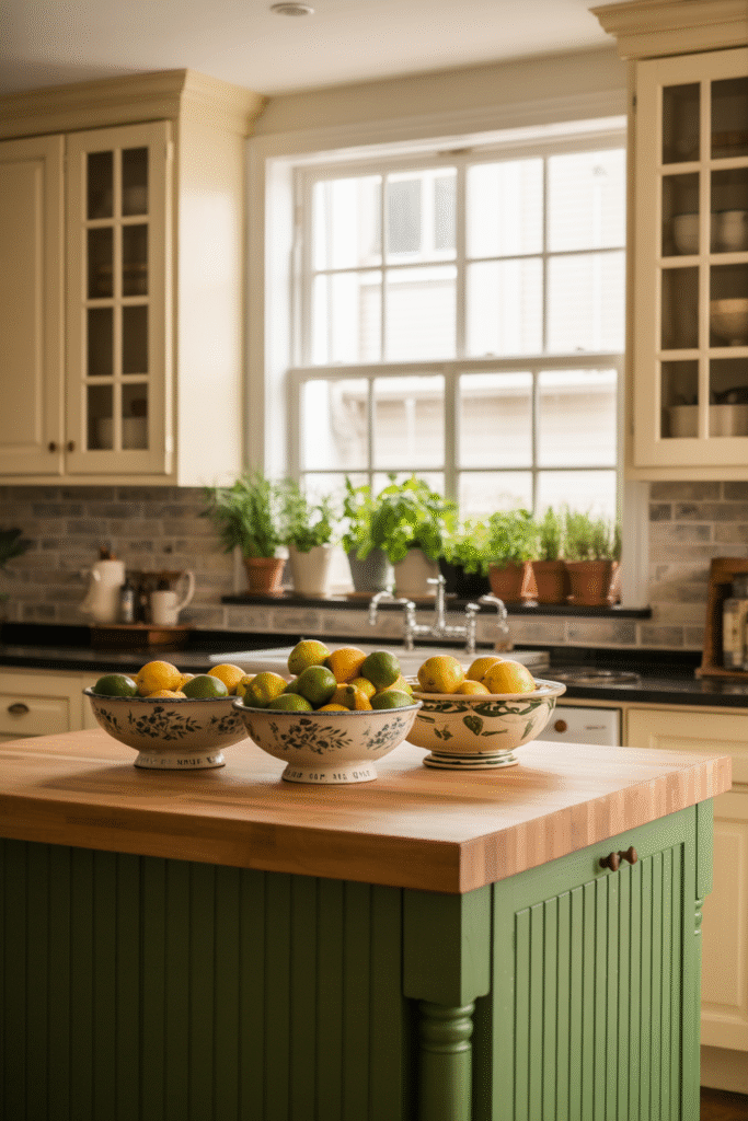 Tip: Green island + wooden countertop = instant farmhouse vibe.