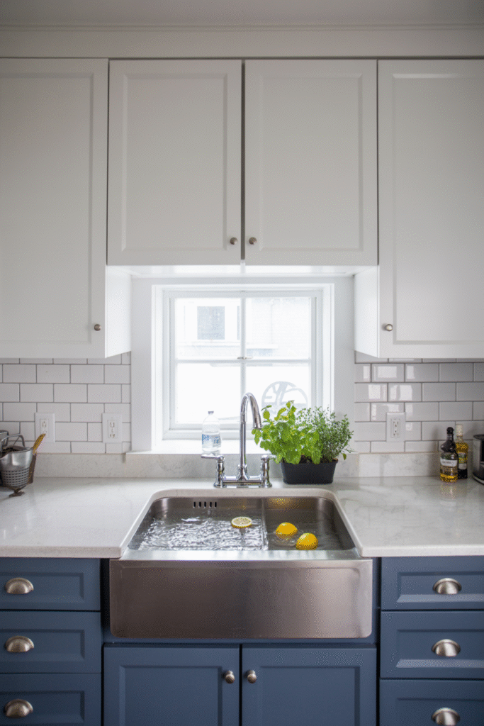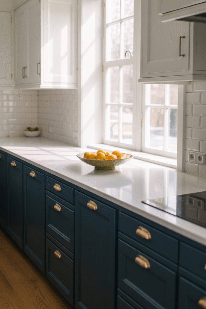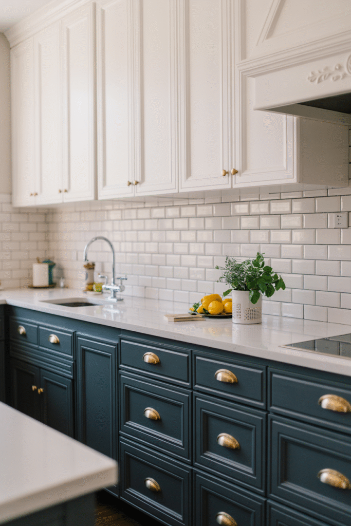 Crisp white upper cabinets paired with crisp navy blue lowers. This is a foolproof combo—bright, welcoming, and instantly classic. I once did this for a client who wanted a “forever” kitchen; after five years, she still loves it.