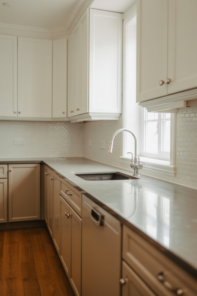 Some people worry that “two-tone” means “two loud, clashing colors in equal measure.” Not in my book. Think of it as a harmony a main color supported by a supporting hue. This could be a bold island with neutral perimeter cabinets, or a classic wood-and-paint mix. It’s about balance, not competition.