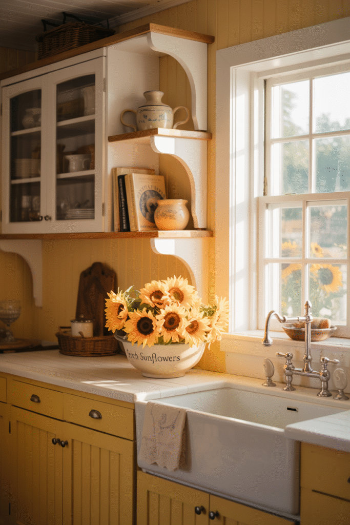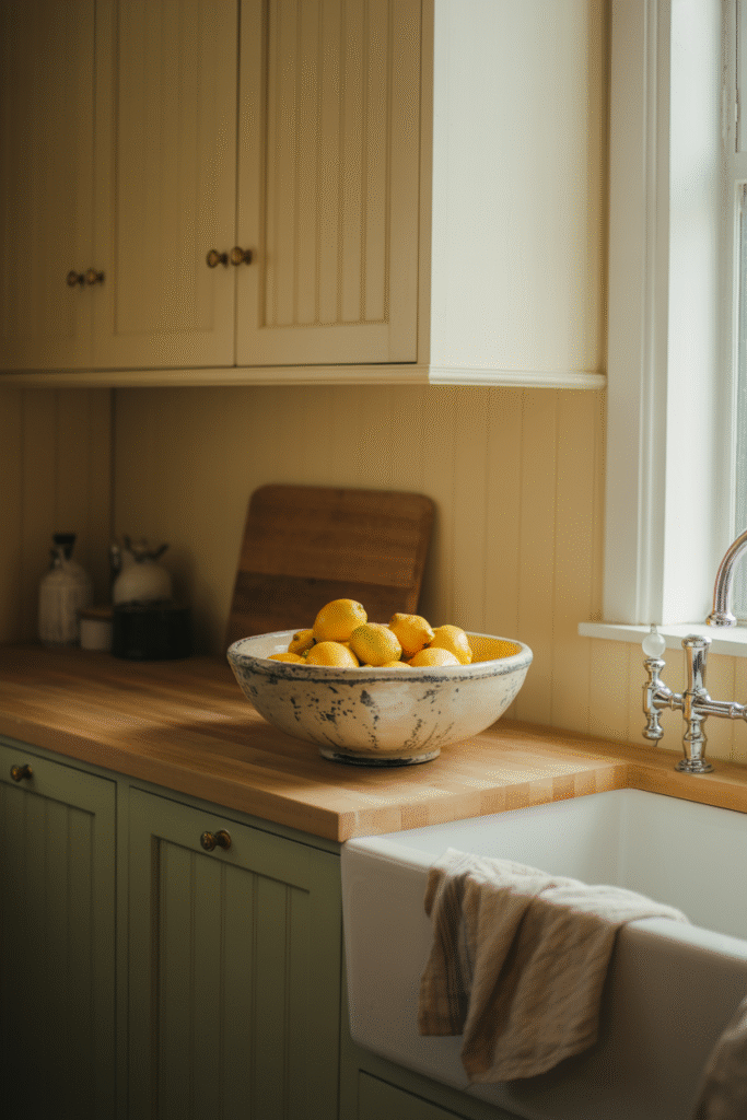 Buttercream yellow lowers with white uppers. Cheerful and light. I did this in a house where the kitchen faced a garden—the yellow echoed the flowers outside and kept things bright even in gray weather.