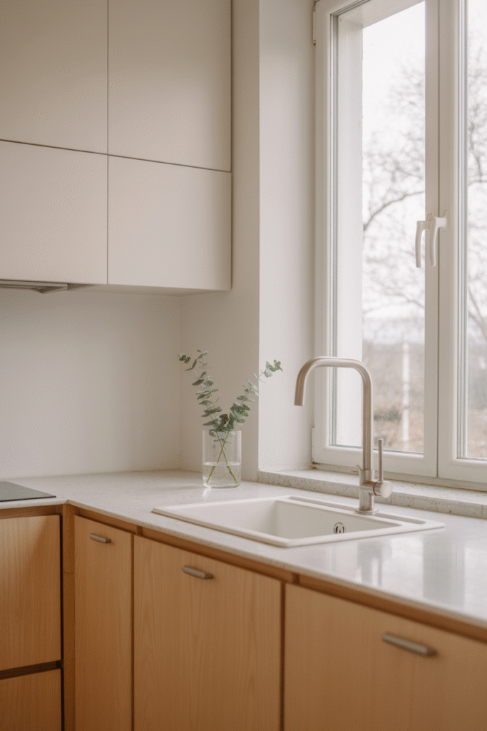 Natural wood (like oak or maple) lowers, sealed with a matte finish, and soft gray uppers. This brings natural texture and modern calm, especially in kitchens with lots of sunlight.