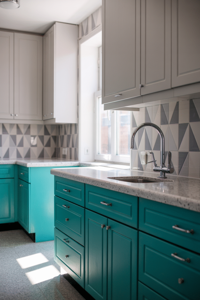 Teal lowers with pale gray uppers. Balanced, modern, and a bit retro. I tried this in a loft-style kitchen and it felt both fresh and classic.