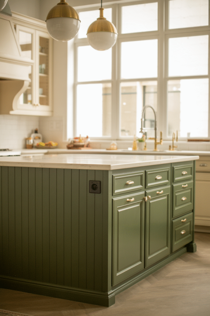 Dark green island (forest, emerald, or olive) with light gray or white perimeter cabinets. Perfect for adding a pop without overwhelming. This is one of the most popular requests I get from clients who like color but aren’t sure about commitment.