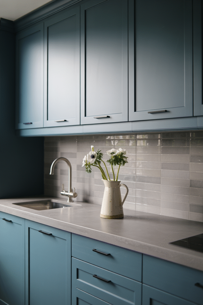 Slate blue lowers with pale gray uppers. Modern, muted, and subtle. I used this in a condo—it felt calm but not bland.