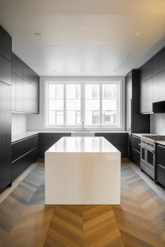 Black uppers with natural wood lowers. Industrial meets warm. I used this in a client’s loft; the black felt edgy, the wood kept things from getting too harsh.