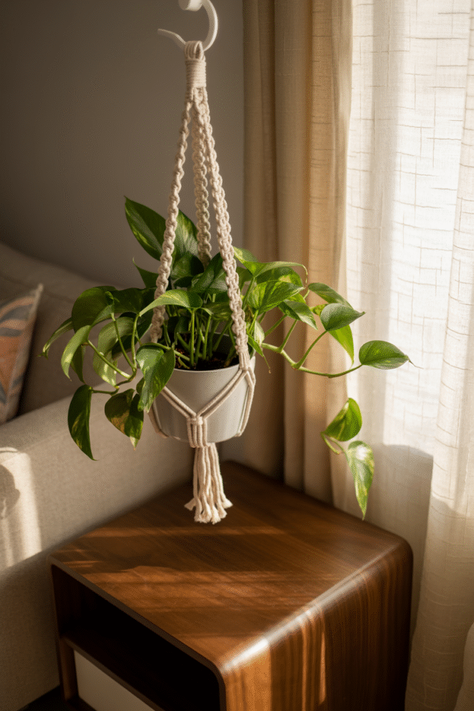 If you’re tight on floor or table space, look up. Hanging planters are a game-changer—seriously, I’ve transformed cramped apartments into green oases this way. I use macramé hangers for trailing plants like pothos, string-of-pearls, or spider plants. They add movement and life to boring corners.
