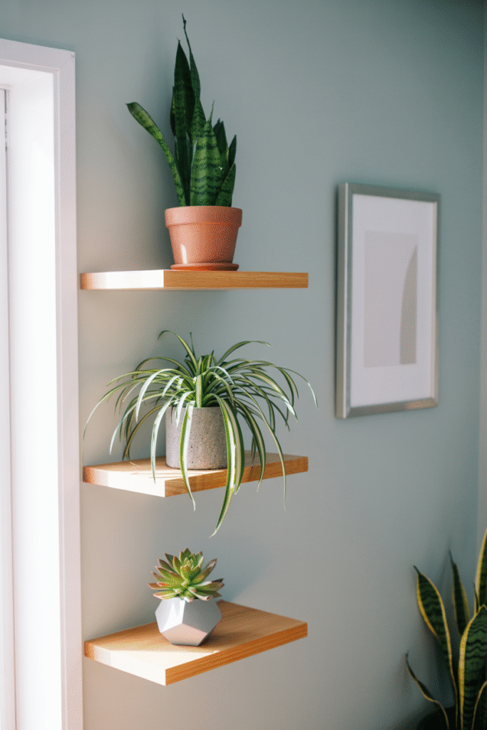 Shelves are perfect for creating “plant vignettes.” I love clustering a mix of textures and heights—maybe a tall snake plant, a mid-height pothos, and a small succulent in a geometric pot. The key is balance. Too many plants can look cluttered, while one lone pot might feel lonely.