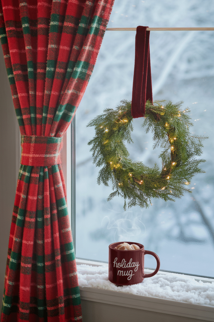 Last Christmas, I draped a red and green plaid scarf over a tension rod—simple, but it tied the room together. For more drama, hang a mini wreath from your curtain rod with a velvet ribbon.