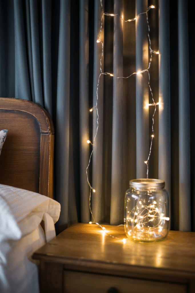- Materials: Battery-operated fairy lights (preferably warm white), curtain rod or bed frame, glass jar (optional)