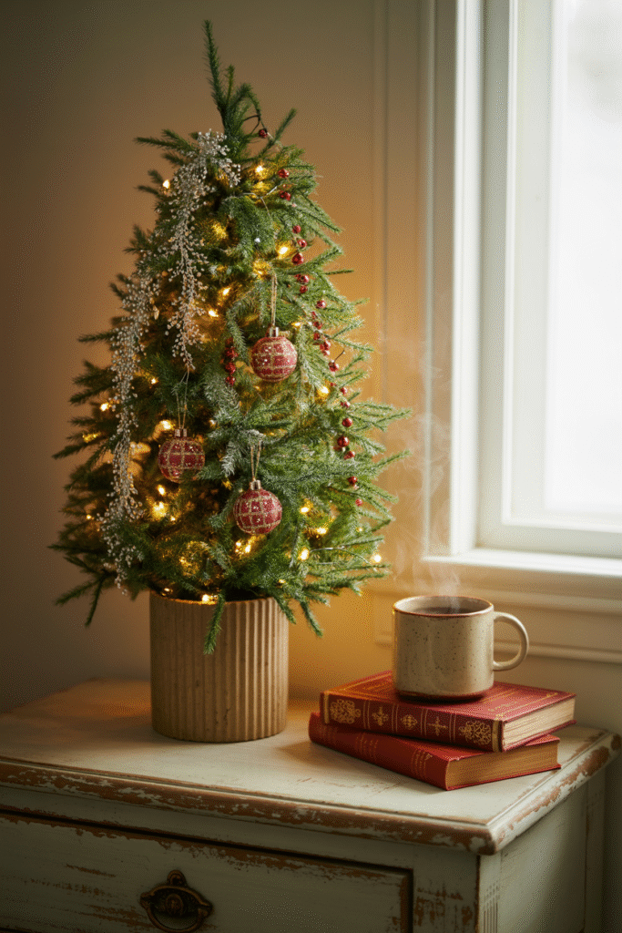 You don’t need a 2-meter (6-ft) tree in your bedroom to get the holiday spirit. What works best is a small tabletop tree (about 30–60 cm / 12–24 in tall) on a dresser or side table. Decorate it with tiny ornaments, mini LED lights, and a few strands of tinsel.
