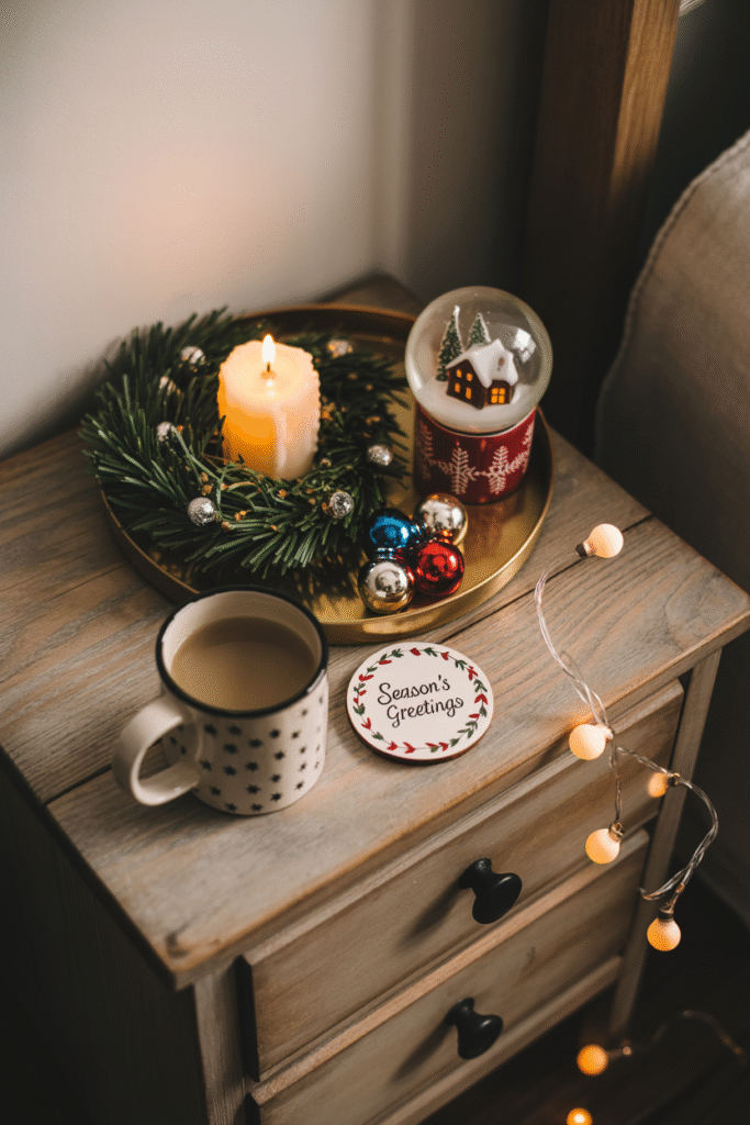A festive nightstand is easy to overlook, but it can make your mornings feel special. What works best: A small holiday-themed tray with a candle, a mini wreath, and a tiny snow globe or ornament cluster.