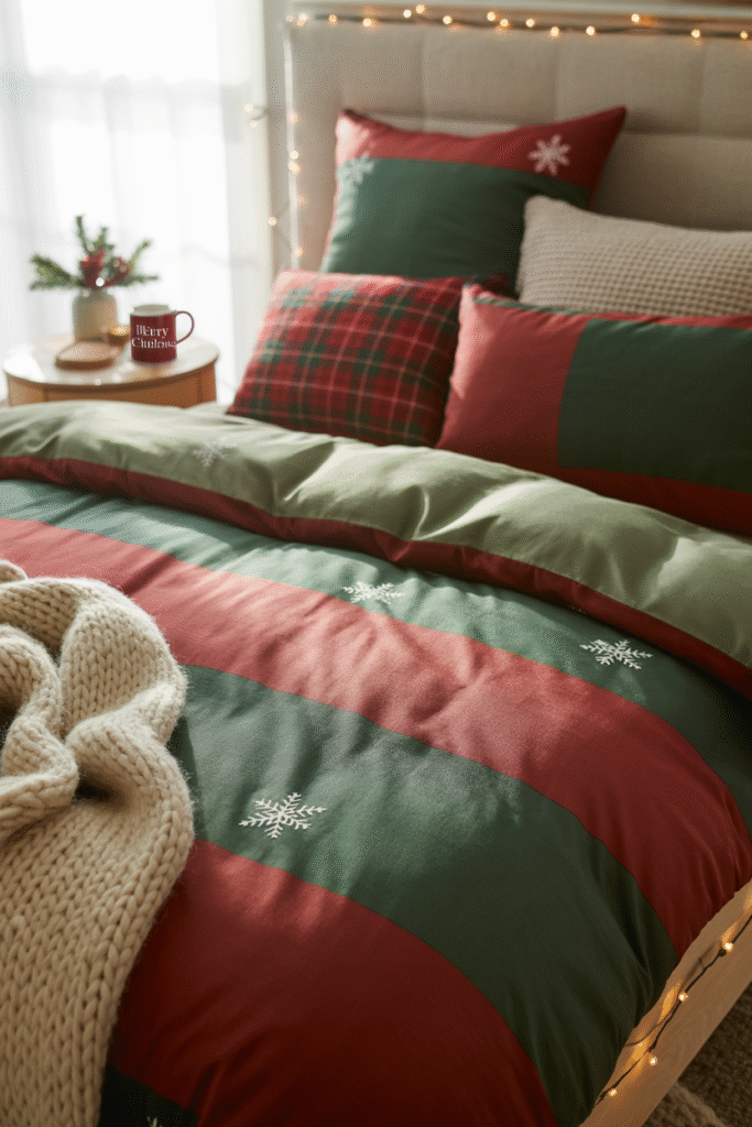 - Materials: Duvet cover, holiday-themed pillowcases, quilt or throw, festive cushion covers