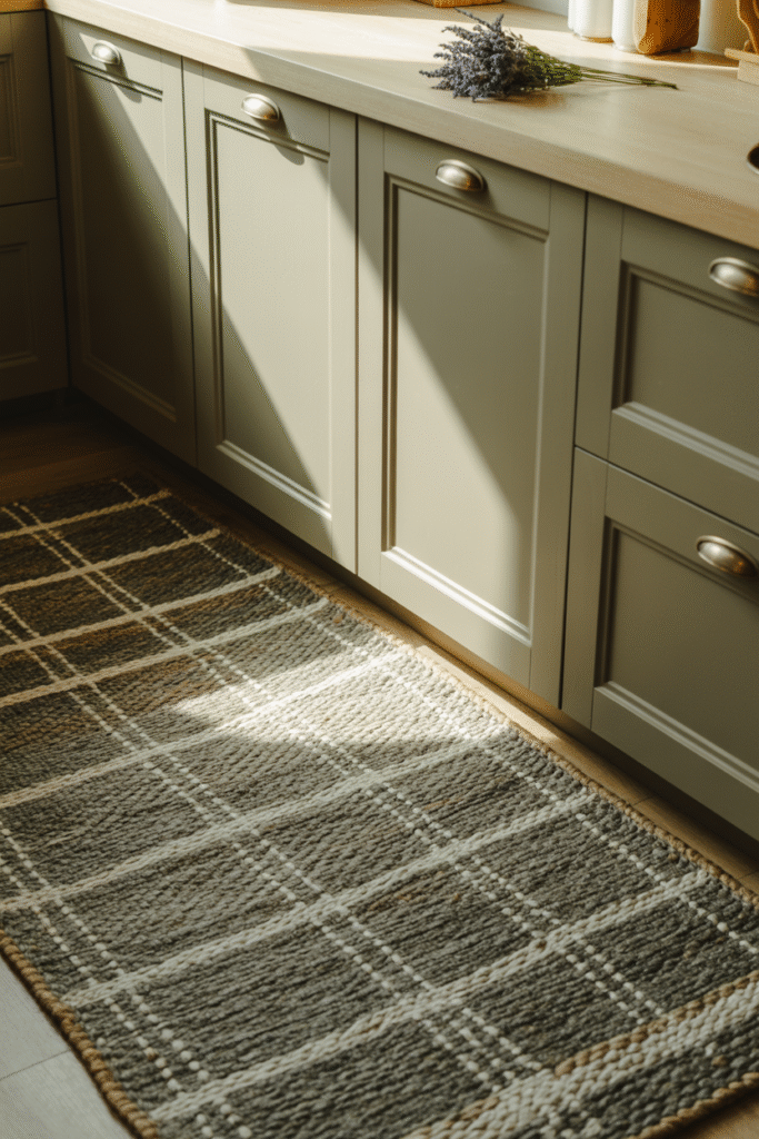 A simple rug can transform the space. In fall and winter, I swap my thin cotton runner for a thicker jute or wool-blend rug, around 60 × 180 cm (24 × 72 inches), which makes standing while cooking much more comfortable. Choose patterns in deep reds, olive greens, or even a muted plaid.