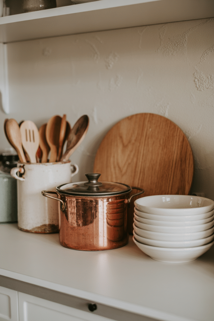 Fall is the season when shiny metal feels too cold. I like to swap in copper utensils, wooden chopping boards, and handled serving spoons as visible decor.