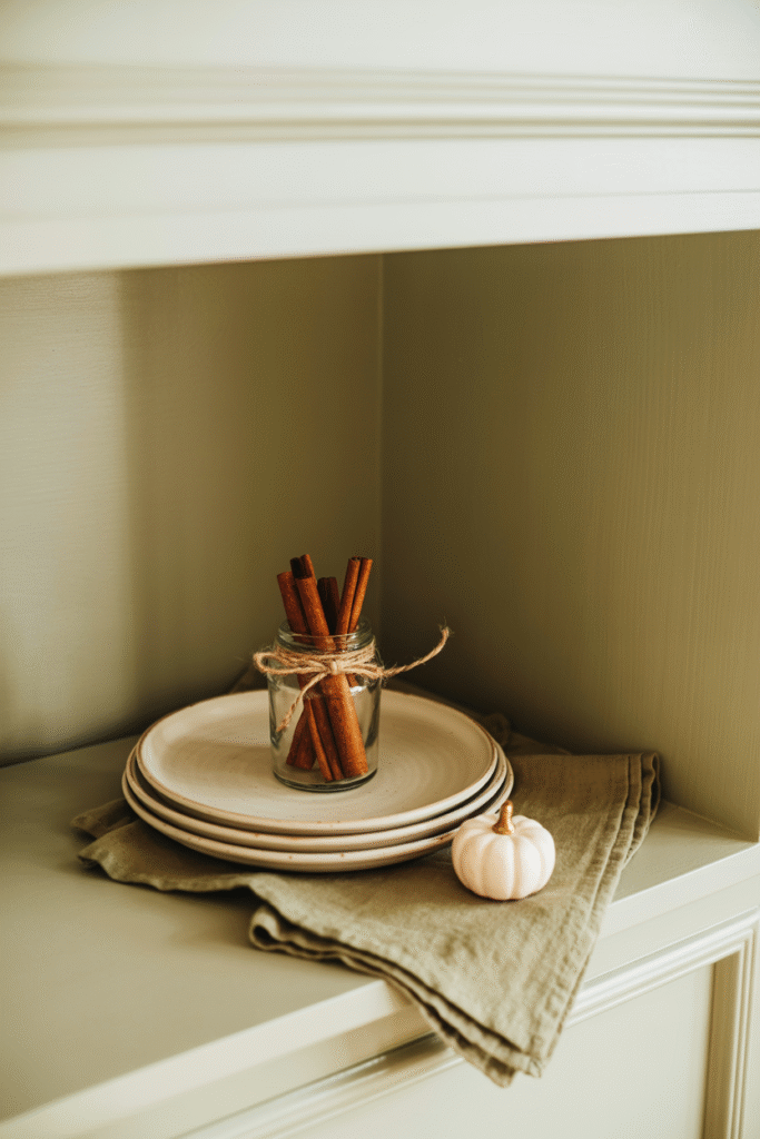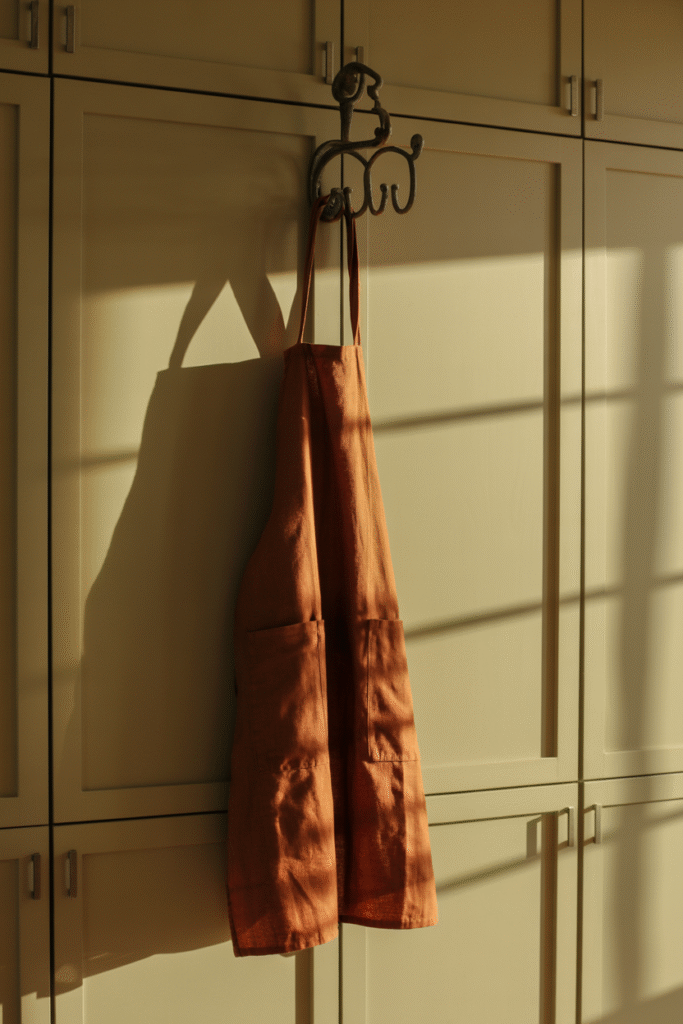 I keep a linen or canvas apron in autumn tones hanging visibly on the pantry hook. It’s practical and adds a lived-in charm. Think burnt orange, maroon, or olive green.