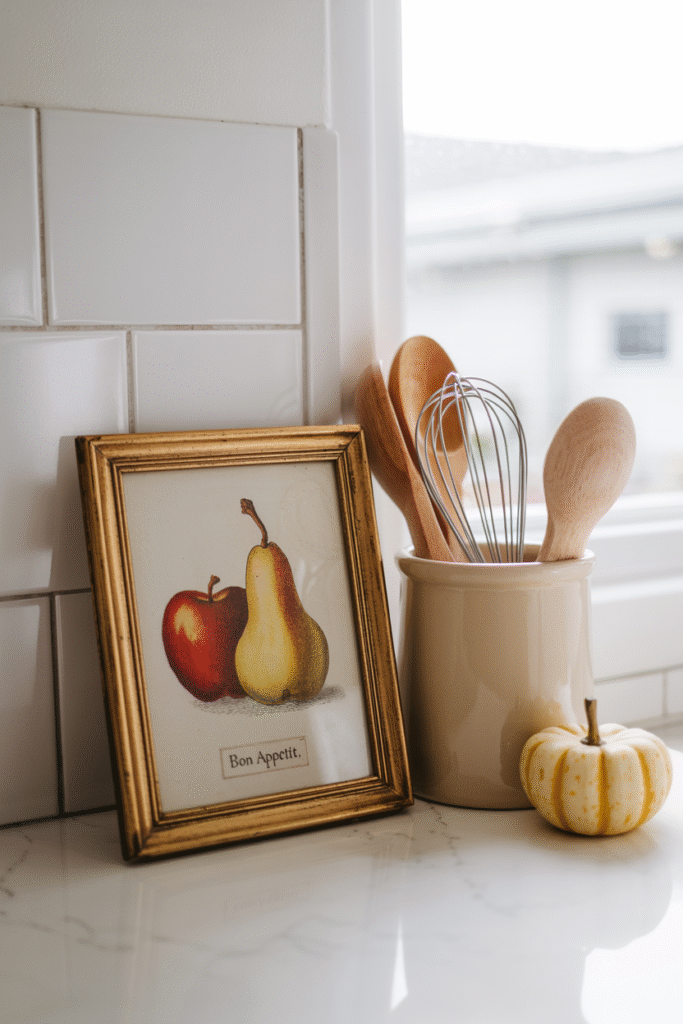 Swapping even one frame on the kitchen wall to an autumn print can shift the whole feel. I’ve used vintage fruit illustrations printed at home and slipped into basic frames. If you don’t want to drill holes, prop them up on the counter against the backsplash.