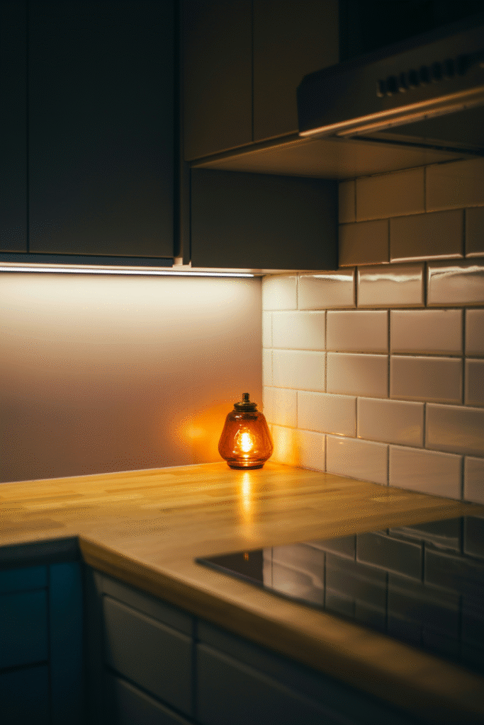 Coziness is half about lighting. For fall kitchens, I like to use warm LED under-cabinet strips (Kelvin rating around 2700K) that create a soft glow in the evening. Add two or three glass lanterns or mini lamps with amber bulbs on the counter, and suddenly your kitchen feels more like a cozy café than a workspace.