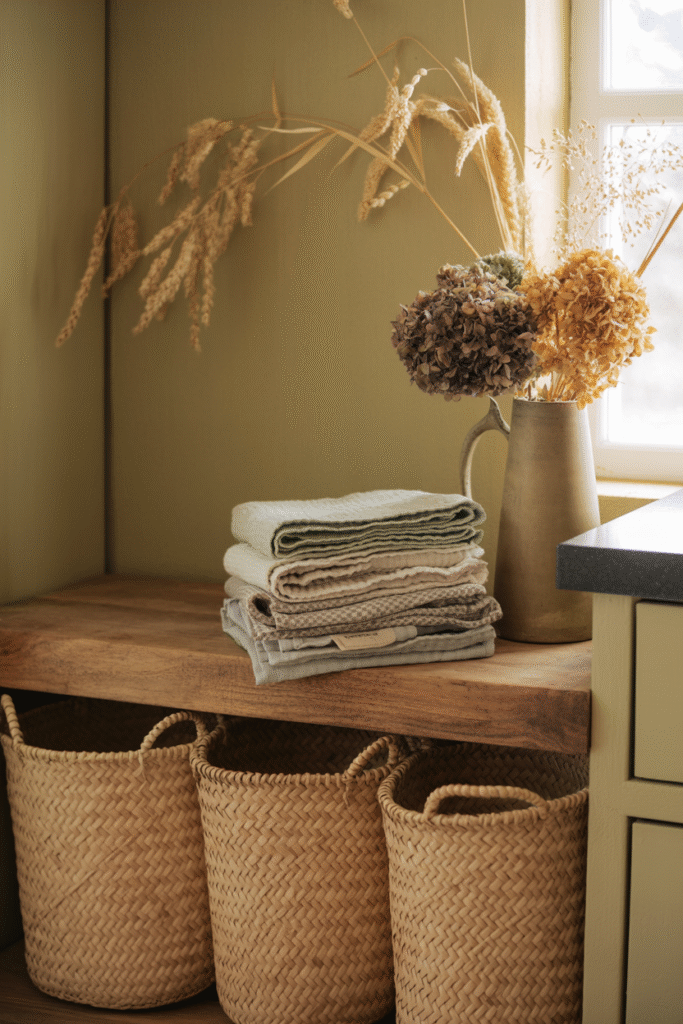 Natural woven baskets bring texture and warmth while hiding everyday clutter. I keep one by the back door for odds like reusable bags, and another under an open shelf where I toss extra linens. Seasonal bonus: baskets double as produce storage for squash, onions, or potatoes.
