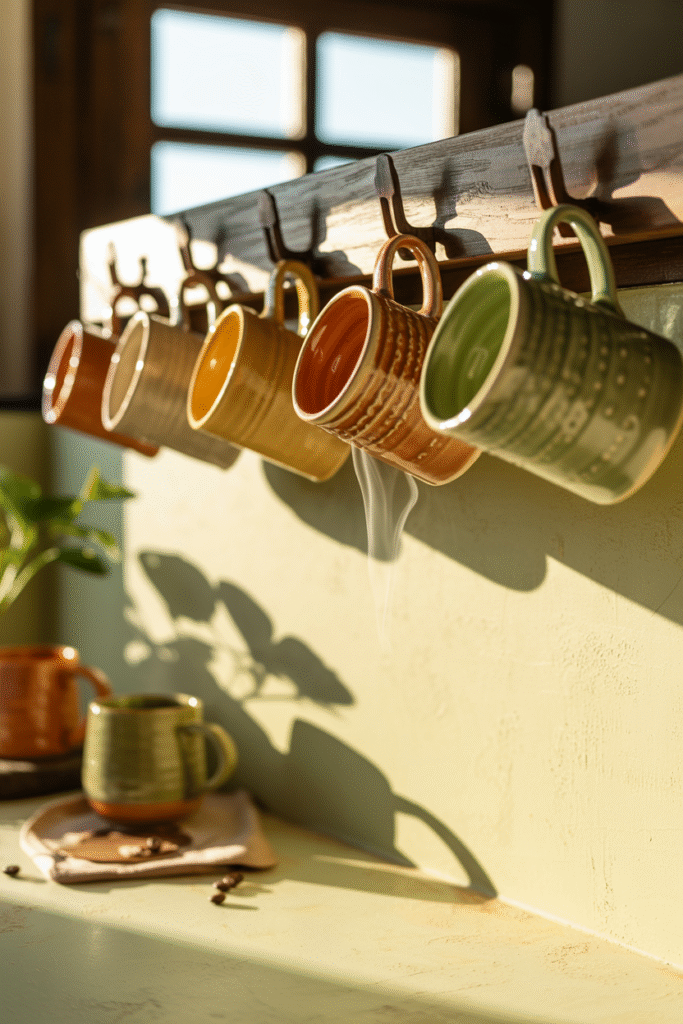 This is one of those subtle details that people don’t always consider. Replace your plain white mugs with heavier, hand-thrown pottery mugs or even colored stoneware. Having them stacked or hung by hooks above the counter means every tea or coffee break feels more comforting.