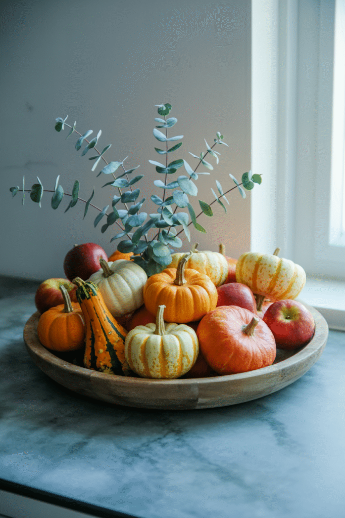 I once filled a shallow wooden bowl with nothing but red apples and a sprig of eucalyptus, and it looked like a magazine spread. Spend about ($7–8) and you’ve got a centerpiece you can snack on.