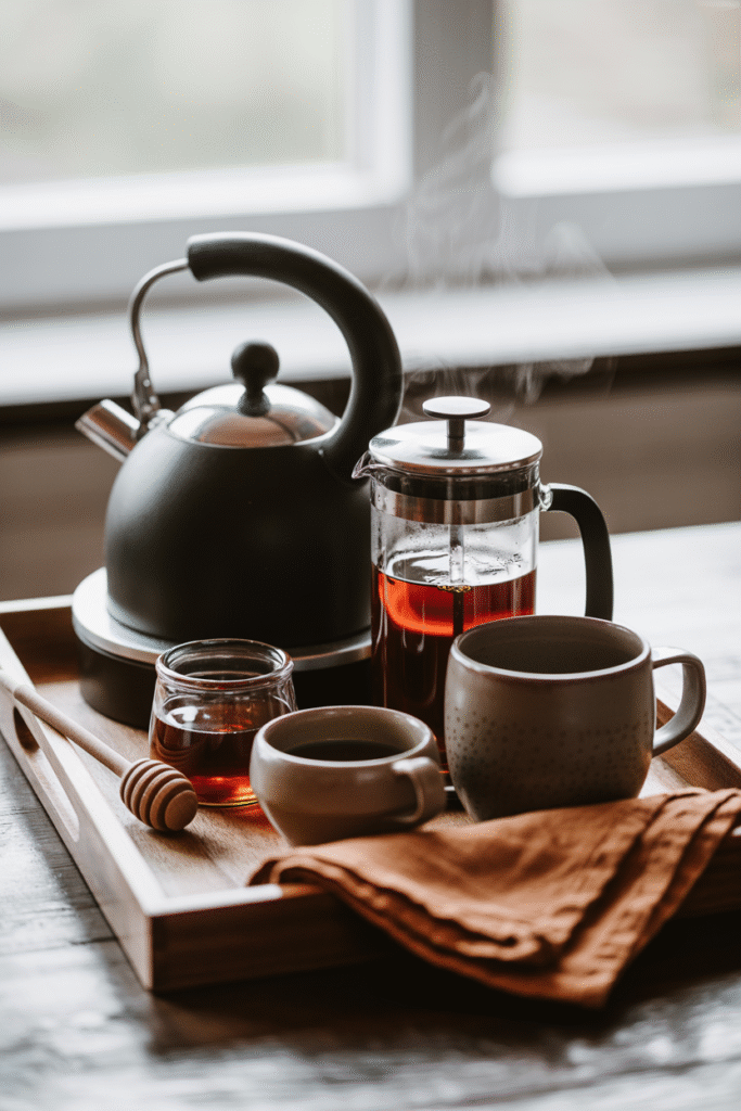 Fall mornings feel better if you’ve got a little hot-drink station. Use a small tray to corral: