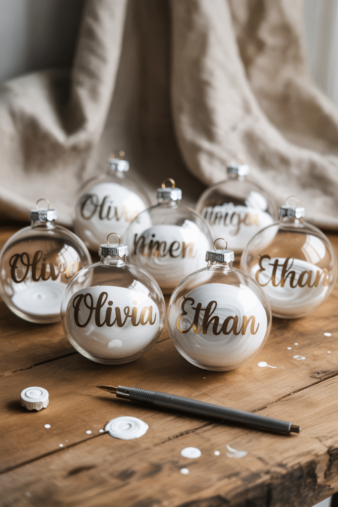 - Method: Pour a little paint inside the bauble and swirl, then let dry. Add names or patterns with the paint pen.