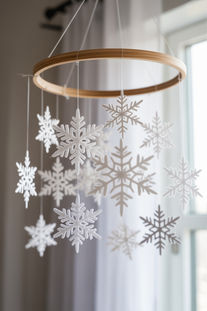 - Materials: felt snowflakes, embroidery hoop, fishing line.