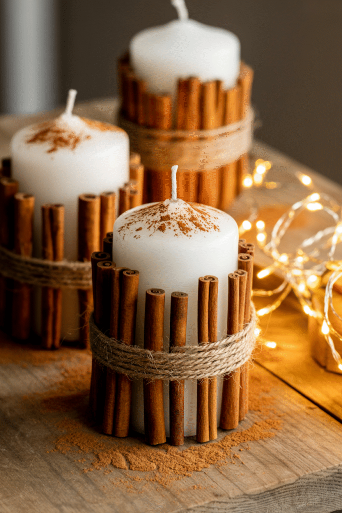 - Method: Attach cinnamon sticks vertically all around the candle, then tie them with twine.