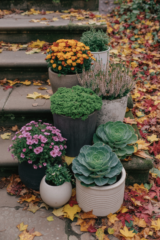 Mums aren’t your only option. I rotate kale, ornamental cabbages, pansies, and heathers. Group them in clusters of three for impact: large (40 cm/16 in pot), medium (30 cm/12 in), and small accent herbs.