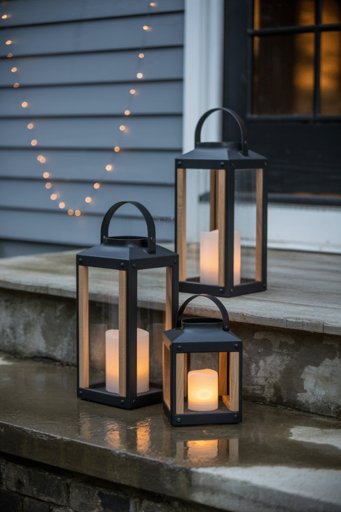 - Metal or wood lanterns with LED candles (avoid real ones if you get windy weather).