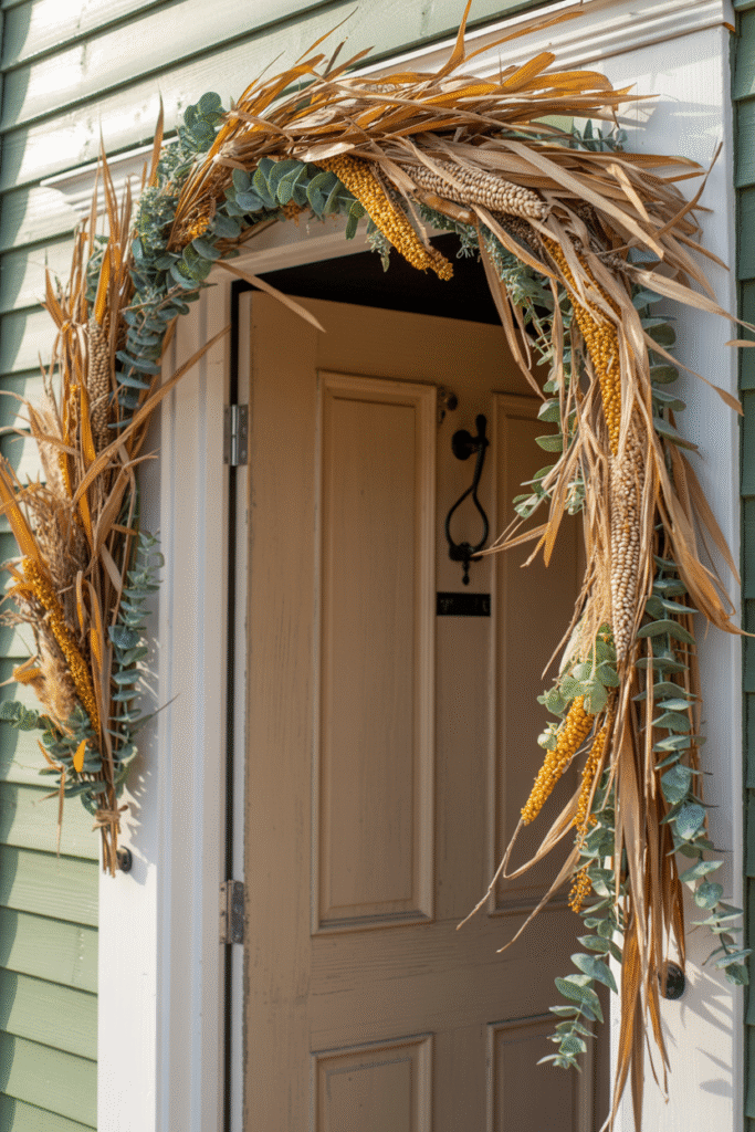 One year, I experimented with cornstalks tied with garden twine and layered with faux eucalyptus garlands. It held up brilliantly for over a month.