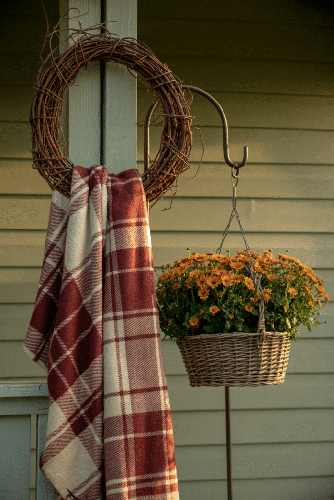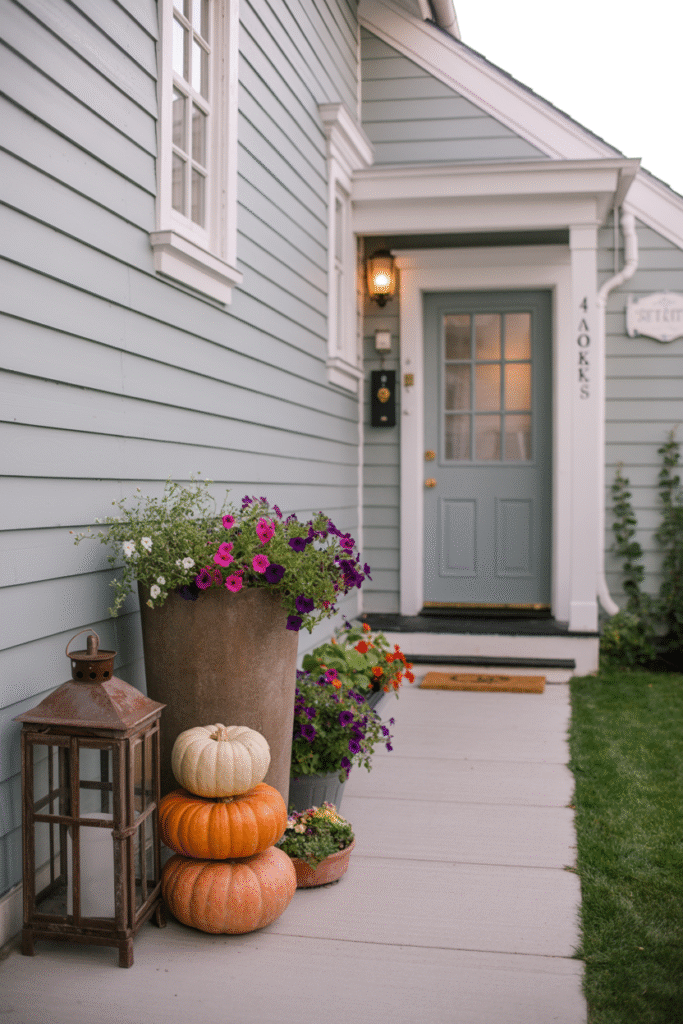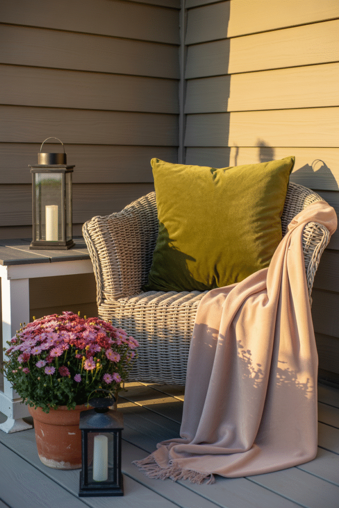 I once paired matte black lanterns with soft olive cushions and plum-colored mums—it stood out from every other porch on the street.