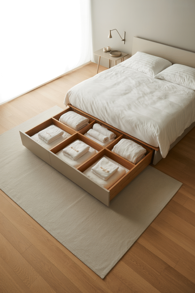 - Under-sofa boxes: Slim rolling bins can slide under most sofas (clearance of 12–15 cm / 5–6 in). Great for kids’ toys or spare blankets.