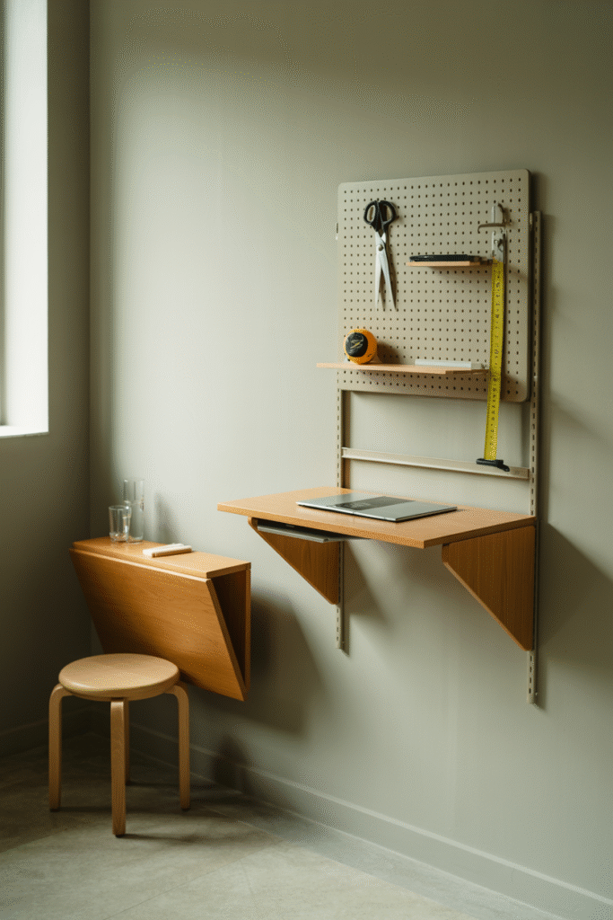 - Fold-out desks: These can be mounted on walls and folded away when not in use—perfect for hobby areas.