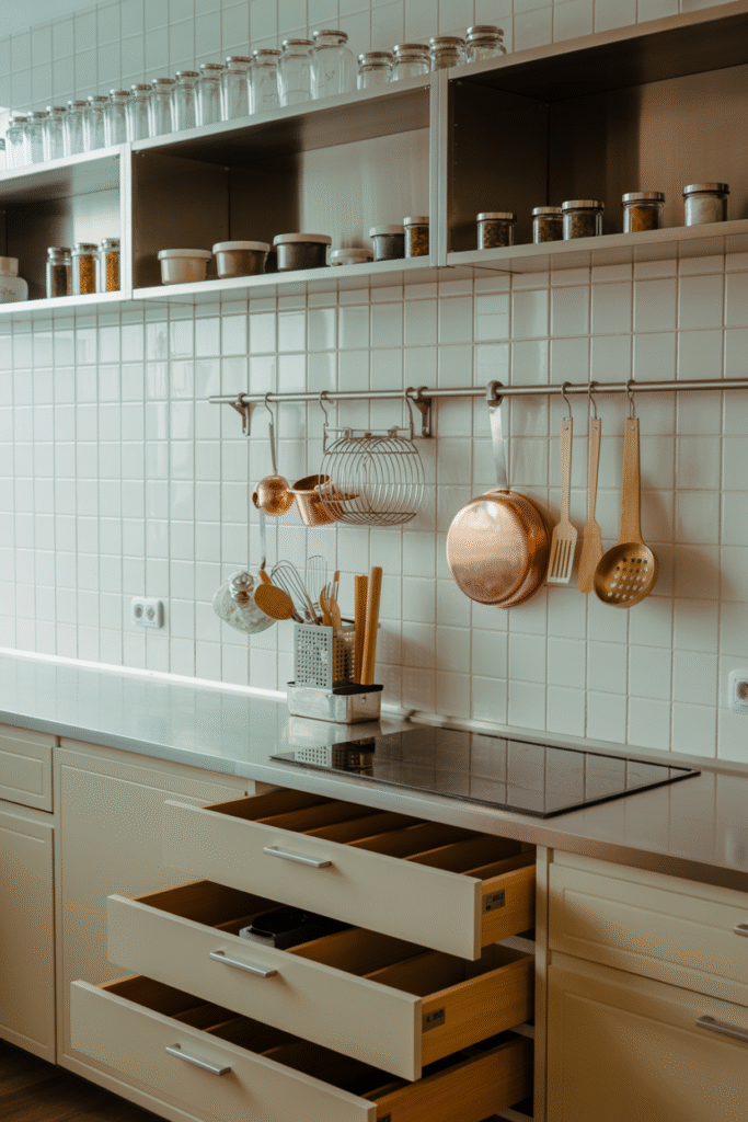 - Wall-mounted storage: Floating shelves, wall hooks, and hanging racks keep floors clear. For example, in one client’s small kitchen, we gained almost 1.5 square metres (16 sq ft) by moving pans onto a wall rail instead of a drawer.