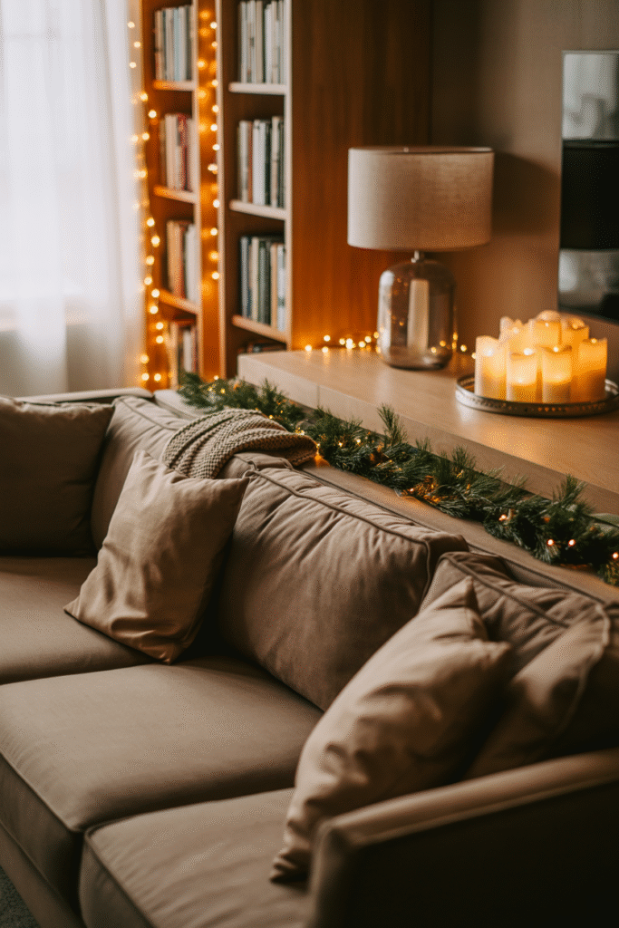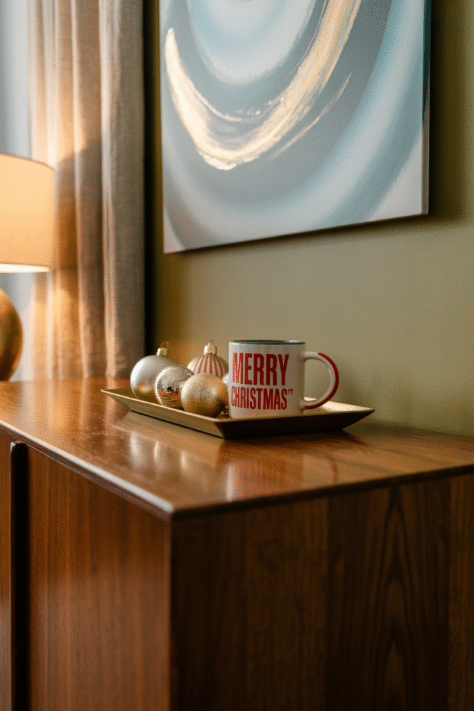 Focus on your coffee table, sideboard, or a corner console. Use layered lighting, a mini tree, or a collection of holiday mugs and cups as a focal point. Mirrors can help bounce light and make the space feel cozier.