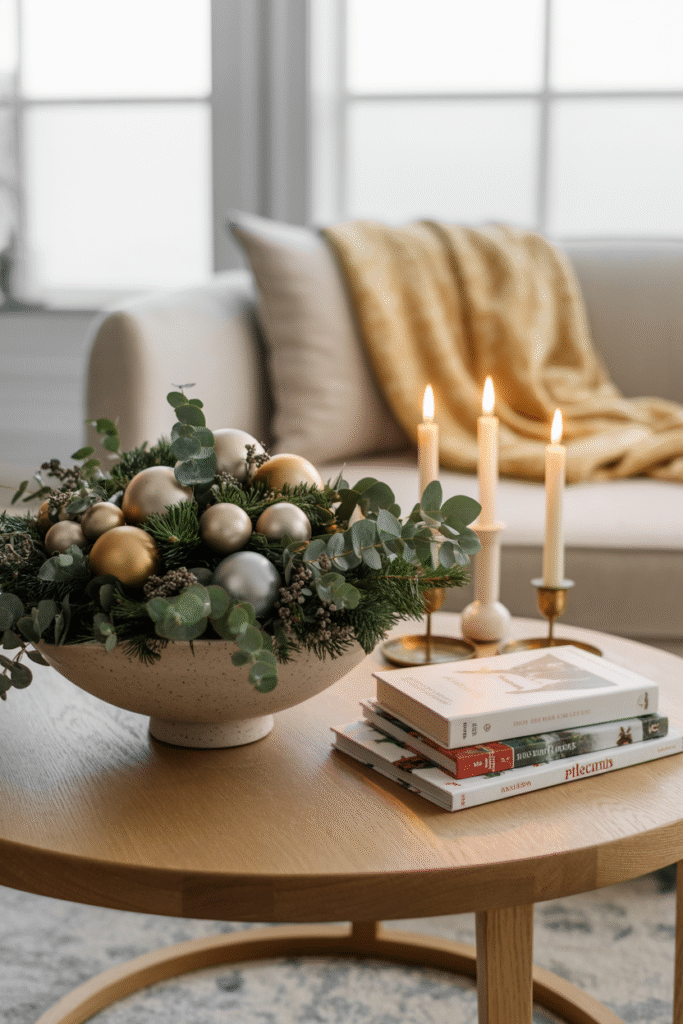 A cluttered coffee table can make the whole room feel messy. Clear off non-essentials and create a simple, styled vignette: a stack of holiday-themed books, a bowl of ornaments, and a small vase with seasonal greenery. If you have kids or pets, opt for shatterproof ornaments and avoid anything fragrant that might tempt curious noses.