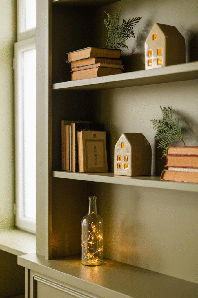 Bookshelves and display cabinets are perfect for small, impactful changes. Swap out a few everyday objects for holiday-themed ones, or wrap a garland around stacks of books. I like to use vintage bottles filled with fairy lights—they cast a cozy glow.