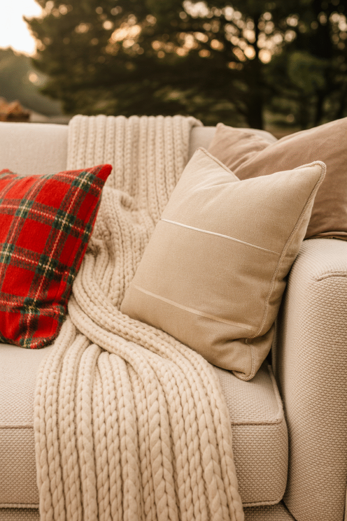 Your sofa and chairs are where everyone gathers, so give them a little holiday love. Swap out everyday throws for chunky cable-knit or faux fur ones in white, red, or cream. Add a few accent pillows with holiday patterns plaid, Nordic reindeer, or subtle metallic stripes. If you have slipcovered furniture, consider switching to a lighter shade for winter.