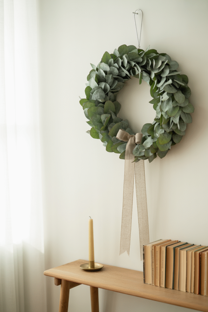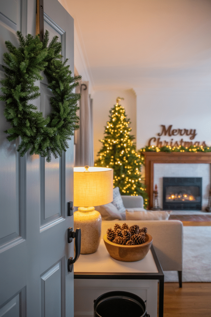 Your living room isn’t an island—carry your theme into the entryway for a cohesive feel. A simple wreath on the door, a small basket of pinecones by the coat rack, and a holiday-themed doormat make the whole home feel festive from the moment guests arrive.