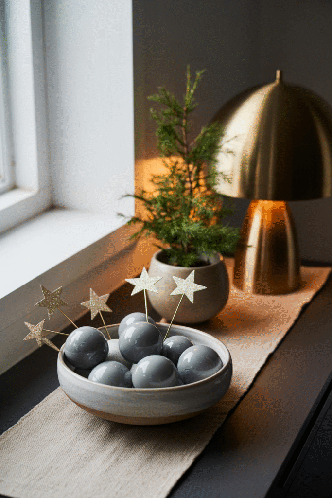 In my experience: A bowl of matte ceramic balls with a few glittery stars on top looks chic and is kid-friendly.