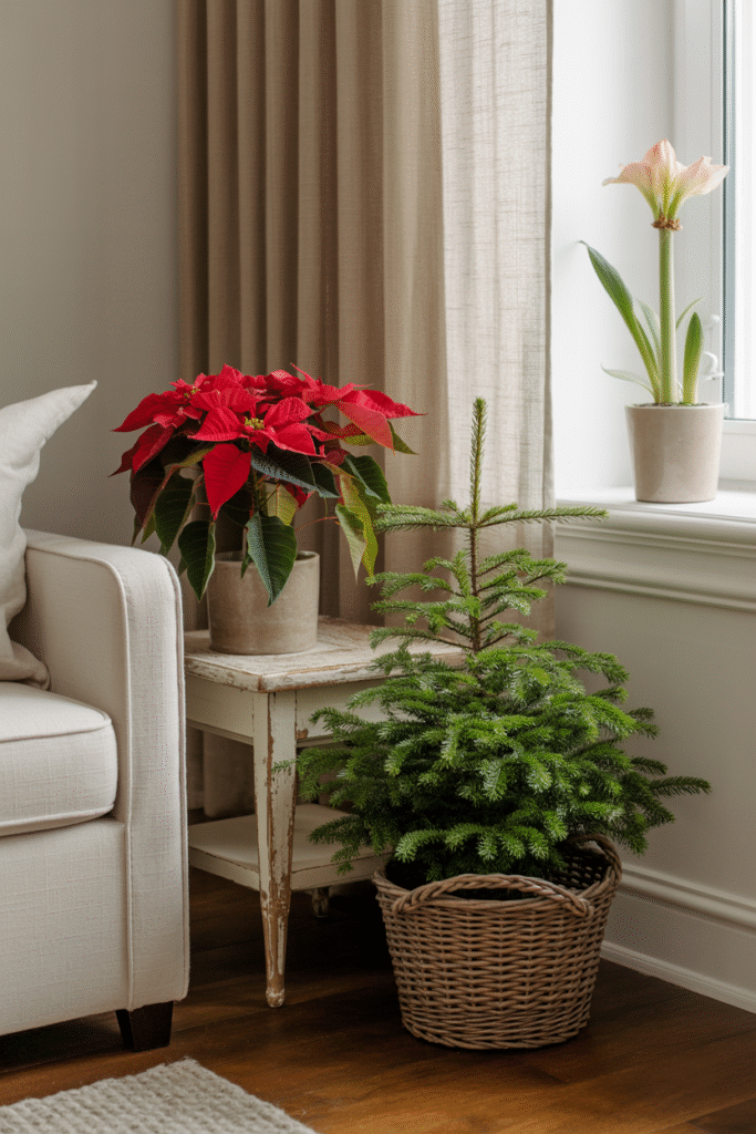 Poinsettias, amaryllis, and mini evergreens add life and color. Place them on side tables, mantels, or as a centerpiece. If you lack green thumbs, high-quality faux plants look surprisingly realistic these days.