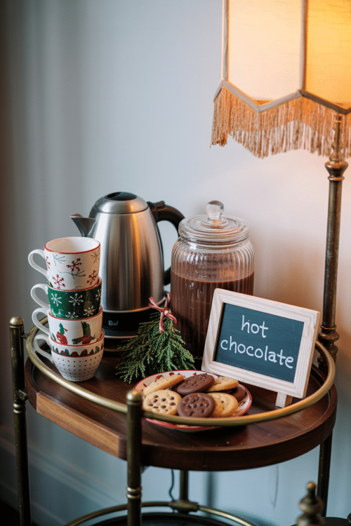 A small table with a kettle, mugs, and a jar of hot chocolate mix invites cozy moments. I like to include a few holiday-themed mugs and a tray of cookies nearby. It’s a practical touch that makes guests feel at home.