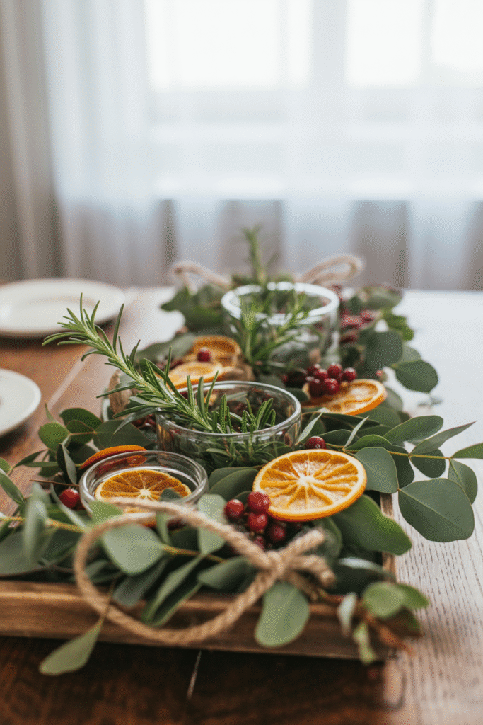 Nothing beats the smell and texture of real pine, citrus, or eucalyptus. If you’re decorating on a budget, skip the expensive faux wreaths and make your own swag with clippings from your garden or a local tree. Tuck sprigs of pine or rosemary into napkin rings, tie cinnamon sticks with twine for ornaments, or float cranberries in glass bowls.
